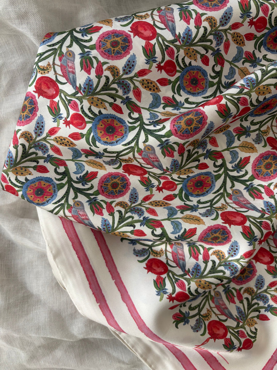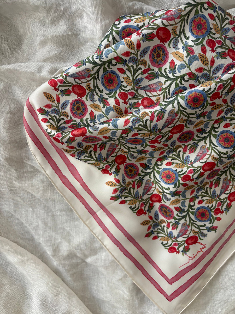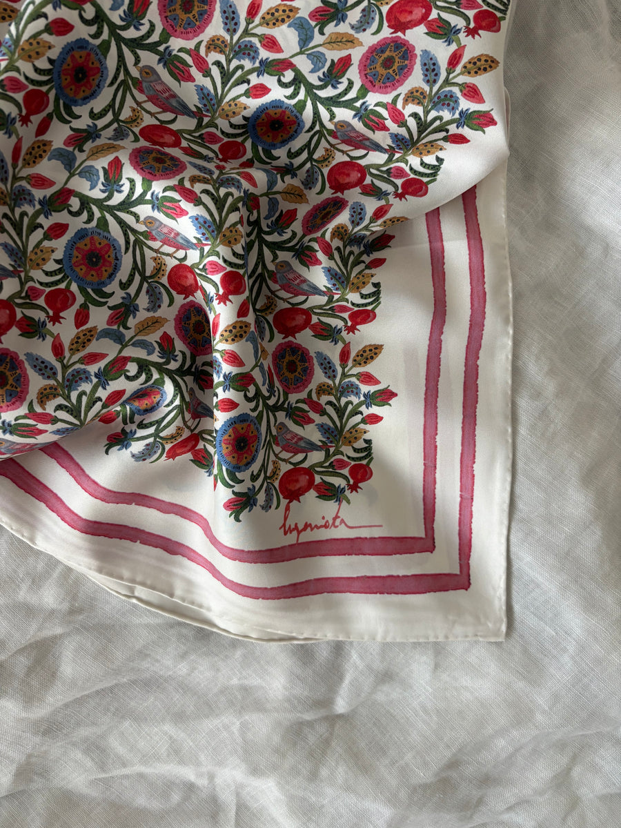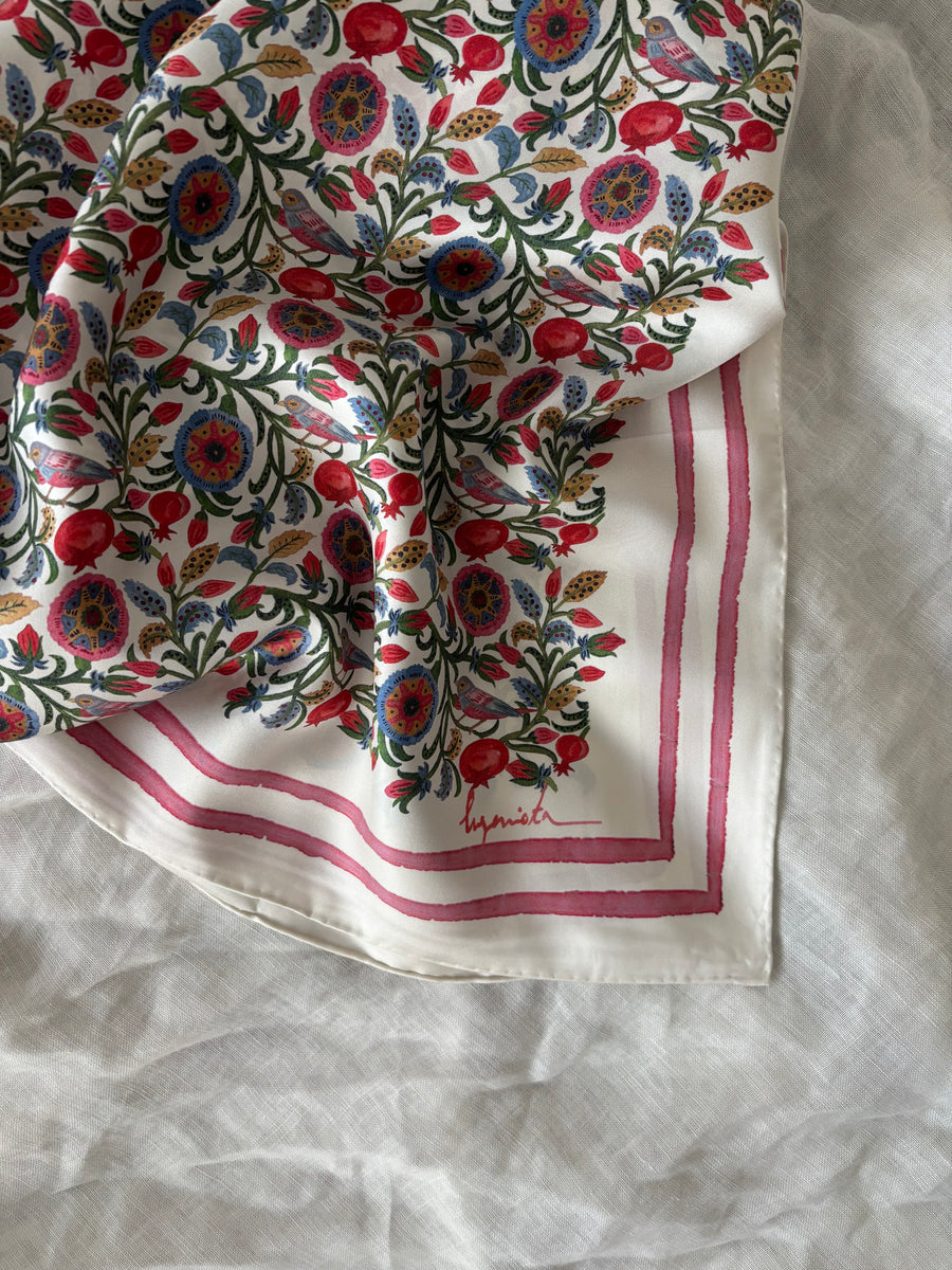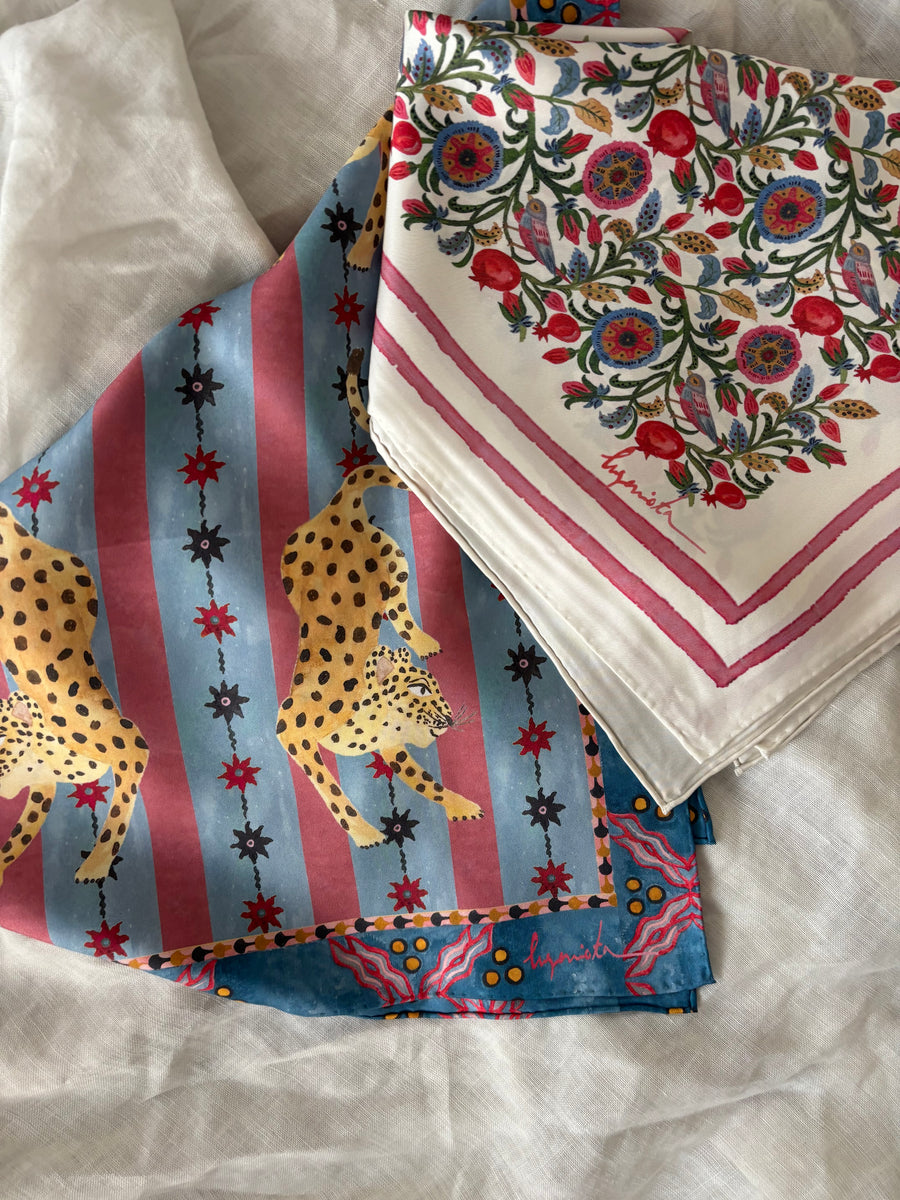 Nuestros pañuelos de seda son impresiones digitales de nuestras acuarelas originales. Son de seda 100% con un alto gramaje que no transparenta. Cosidos a mano. Medidas 90x90 cm.